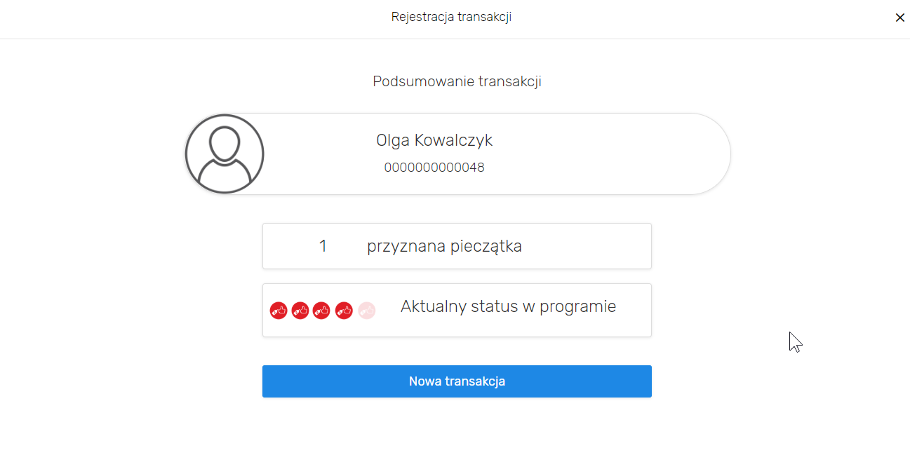 Brawo! Na koncie klienta powinien już znajdować się zapisany punkt. Karta zostanie natychmiast zaktualizowana o nową ilość punktów, a klient otrzyma powiadomienie na numer telefonu przypisany do jego konta.